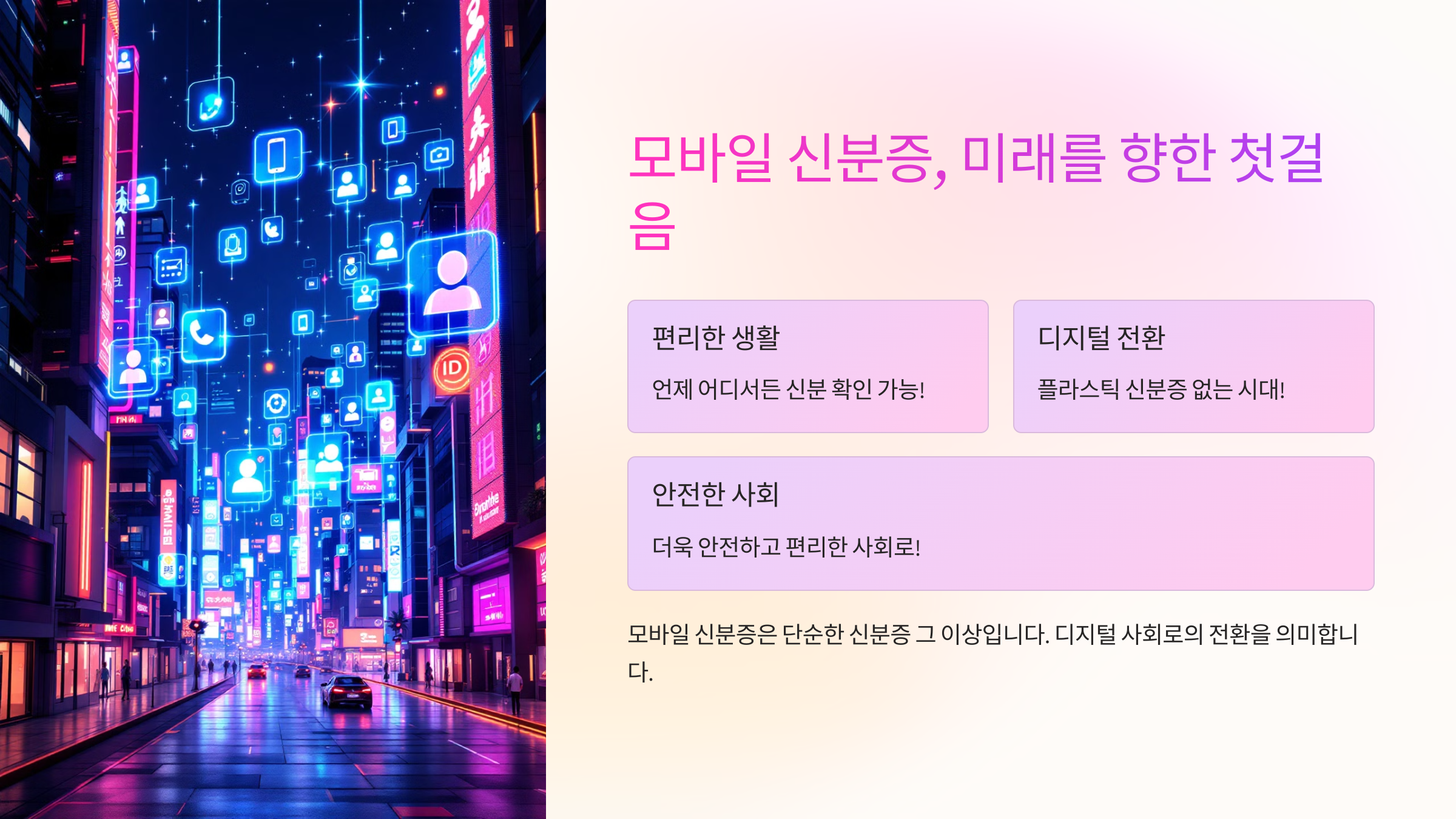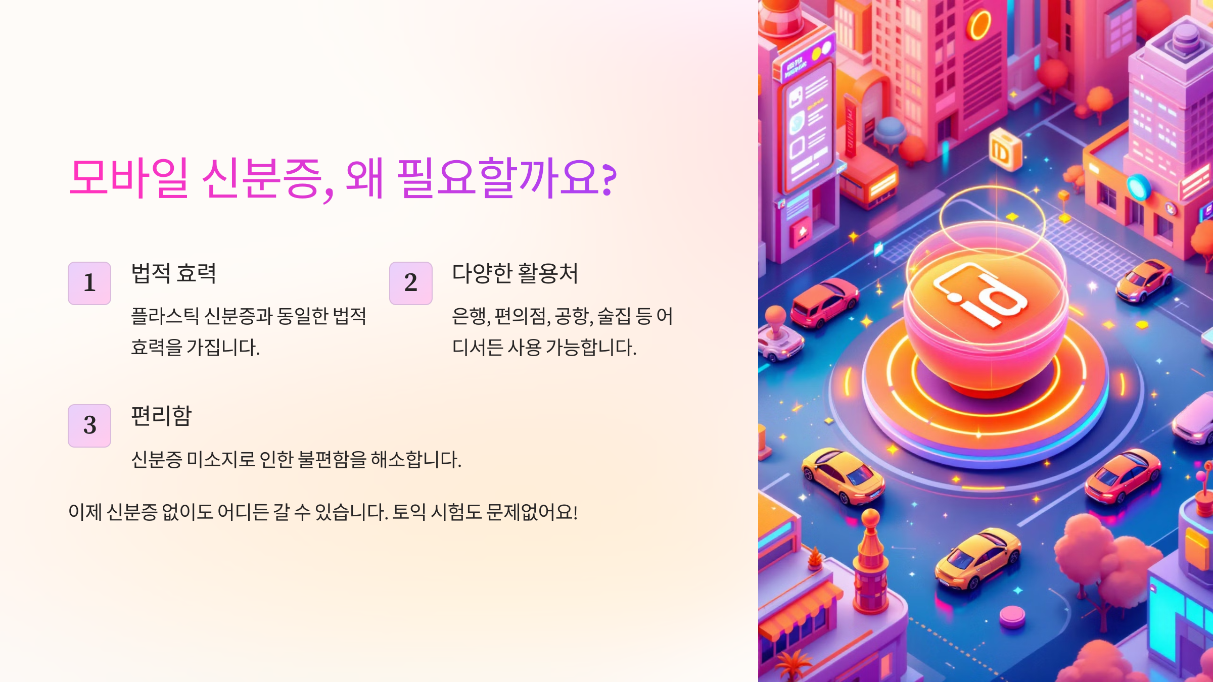 이제 플라스틱 신분증 없이도 은행, 편의점, 공항 등에서 유용하게 사용할 수 있는 모바일 신분증의 법적 효력을 설명하고 있습니다.
